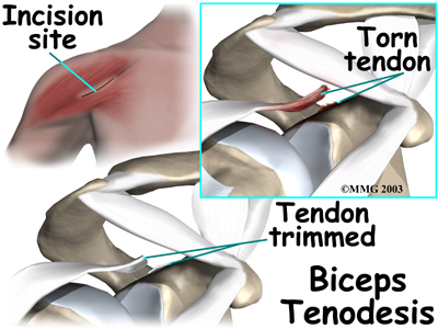 The surgeon begins by making an incision on the front of the shoulder, just above the axilla (armpit). The overlying muscles are separated so the surgeon can locate the damaged end of the biceps tendon. The end of the biceps tendon is prepared by cutting away frayed and degenerated tissue.