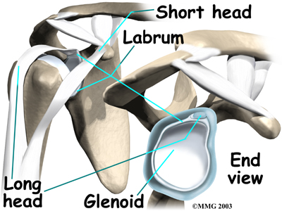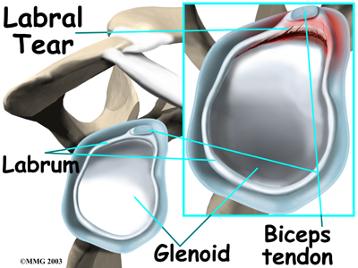With chronic instability of the shoulder the labrum (the cartilage rim that deepens the glenoid, or shoulder socket) may begin to pull away from its attachment to the glenoid, sometimes near where the biceps tendon attaches. A shoulder dislocation can also cause the labrum to tear. When the labrum is torn, the humeral head may begin to slip up and forward within the socket. Once again, the biomechanics of the shoulder joint are affected and the biceps tendon often becomes inflamed as a result.
