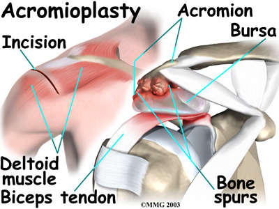 The bursa sac that lies just under the acromion is removed. Next, a surgical tool is used to cut a small portion off the front of the acromion. The ligament arcing from the acromion to the corocoid process (the coracoacromial ligament) may also be removed.