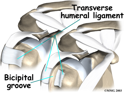 Beginning at the top of the glenoid, the tendon of the long head of the biceps runs in front of the humeral head. The tendon passes within the bicipital groove of the humerus and is held in place by the transverse humeral ligament. This design of the anatomy keeps the humeral head from sliding too far up or forward within the glenoid.