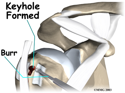A burr is used to form a keyhole-shaped cavity within the bicipital groove. The top of the cavity is round. The bottom is the slot of the keyhole, which is made the same width as the biceps tendon.