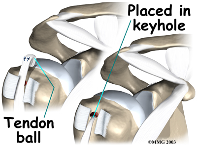 The surgeon rolls the top end of the biceps tendon into a ball. Sutures are used to form and hold the ball in place. The elbow is then bent, taking tension off the biceps muscle and tendon. Next the surgeon pushes the tendon ball into the top part of the keyhole.