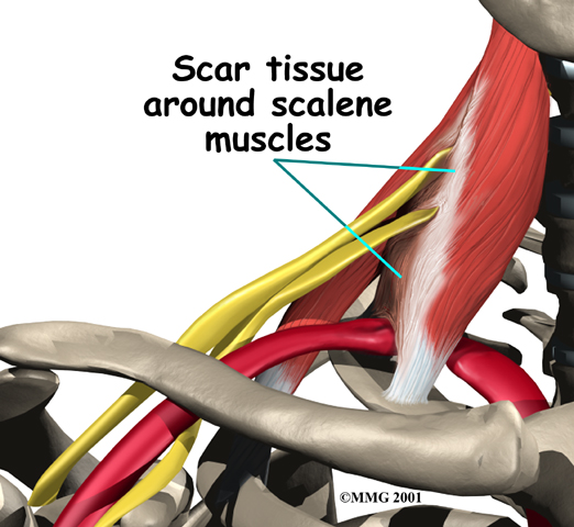Extra muscle or scar tissues in the scalene muscles can put extra pressure on the nerves and arteries. Heavy lifting and carrying can bulk up the scalenus muscles to the point where the nerve and arteries get squeezed.