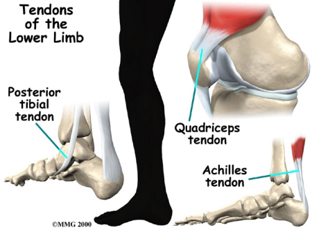 Many parts of the tendon can be injured. Tendon problems can involve the area where the tendon attaches to the bone, the tissue that surrounds the tendon (the tendon sheath), or the main tissues of the tendon. Doctors use different terms to refer to injuries of different parts of the tendon.