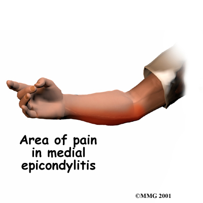 affects the area where the tendons of the elbow attach to bone on the inside of the elbow. It causes pain when using the wrist and hand.