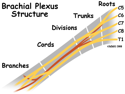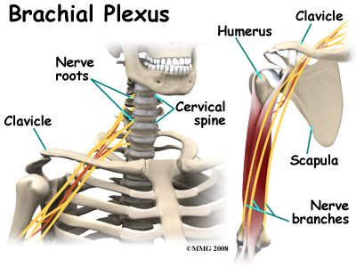 The nerves leave the spinal cord, go through the neck, under the clavicle (collar bone) and armpit, and then down the arm.