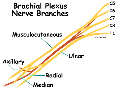 Finally, there are branches that result in three nerves to the skin and muscles of the arm and hand: the median, ulnar, and radial nerves.