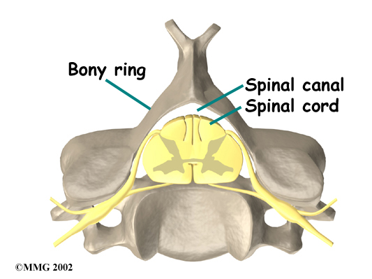 The is made of a column of bones. Each bone, or vertebra, is formed by a round block of bone, called a vertebral body. A bony ring attaches to the back of the vertebral body. When the vertebra bones are stacked on top of each other, the bony rings forms a long bony tube that and protects the spinal cord as it passes through the spine.