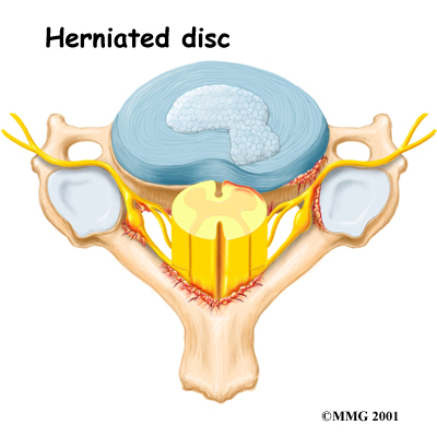 Heavy, repetitive bending, twisting, and lifting can place extra pressure on the shock-absorbing nucleus of the disc. A blow to the head and neck can also cause extra pressure on the nucleus. If great enough, this increased pressure can injure the annulus (the tough, outer ring of the disc). If the annulus ruptures, or tears, the material in the nucleus can squeeze out of the disc. This is called a .