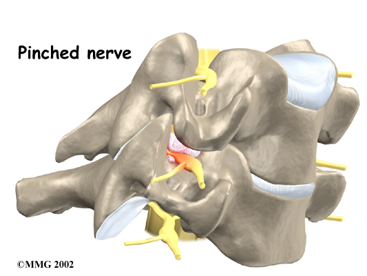 Neck pain has many causes. Mechanical neck pain comes from injury or inflammation in the soft tissues of the neck. This is much different and less concerning than symptoms that come from pressure on the nerve roots as they exit the spinal column. People sometimes refer to this problem as a pinched nerve. Health care providers call it cervical radiculopathy.