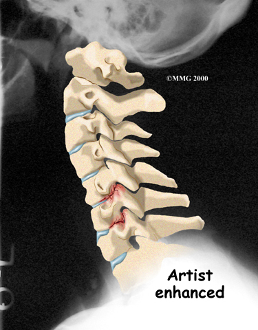 Your physician may order X-rays of the cervical spine to identify the cause of pressure on the nerve. The images show whether degeneration has caused the space between the vertebrae to collapse. They may also show if a bone spur is pressing against a nerve.