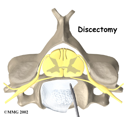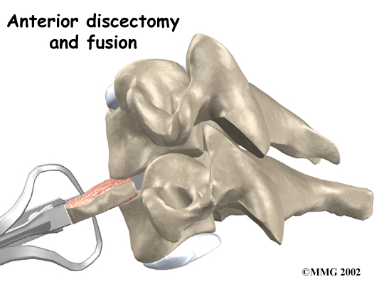 In a discectomy, the surgeon removes the disc where it is pressing against a nerve. Surgeons usually perform this surgery from the front (anterior)of the neck. This procedure is called . In most patients, discectomy is done together with a procedure called cervical fusion, which is described next.