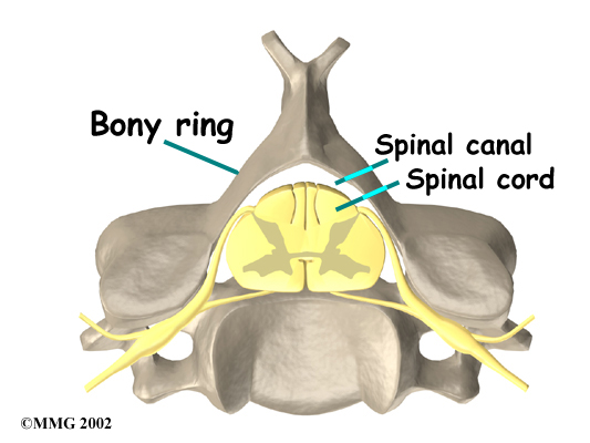Each vertebra is formed by a round block of bone, called a . A attaches to the back of the vertebral body. When the vertebrae are stacked on top of each other, the rings form a hollow tube. This bony tube surrounds the spinal cord as it passes through the spine. Just as the skull protects the brain, the bones of the spinal column protect the spinal cord.