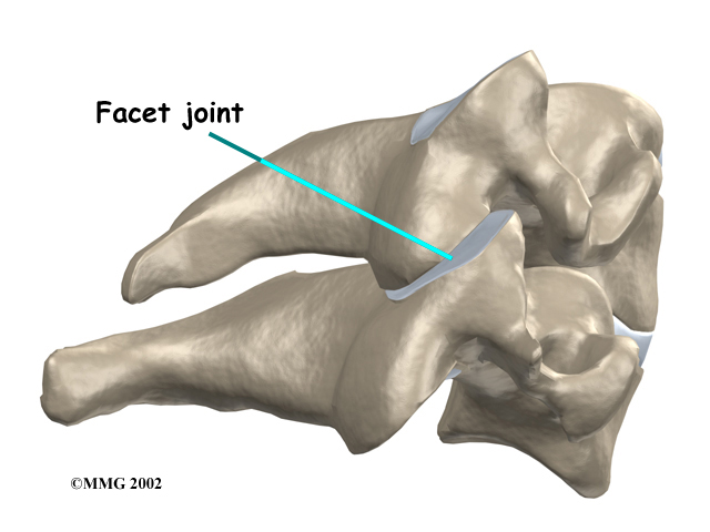 There are two facet joints between each pair of vertebrae, one on each side of the spine. A is made up of small, bony knobs that line up along the back of the spine. Where these knobs meet, they form a joint that connects the two vertebrae. The alignment of the facet joints of the cervical spine allows freedom of movement as you bend and turn your neck.