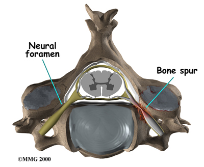 As the degeneration continues, bone spurs develop around the facet joints and around the disc. No one knows exactly why these bone spurs develop. Most doctors think that bone spurs are the body's attempt to stop the extra motion between the spinal segment. These bone spurs can cause problems by pressing on the nerves of the spine where they pass through the neural foramina. This pressure around the irritated nerve roots can cause pain, numbness, and weakness in the neck, arms, and hands.