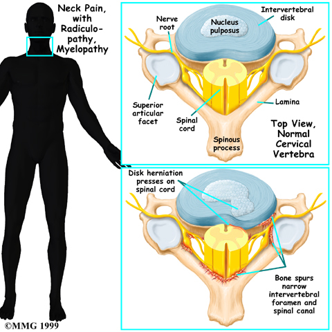 If the herniated disc material presses against a nerve root it can cause pain, numbness, and weakness in the area the nerve supplies. This condition is called cervical radiculopathy (mentioned earlier). And any time the herniated nucleus contacts tissues outside the damaged annulus, it releases chemicals that cause inflammation and pain. If the nucleus herniates completely through the annulus, it may squeeze against the spinal cord. This causes a condition that is even more serious because it affects all the nerves of the spinal cord. This condition is called .