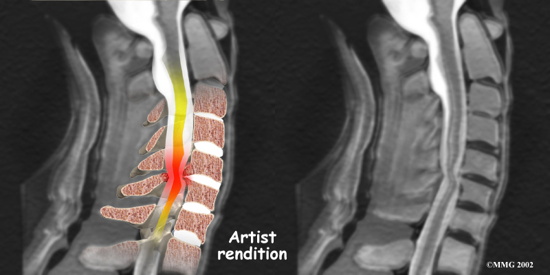 However, stenosis can also develop when a person of any age has a disc herniation that pushes against the spinal canal. When the spinal cord is squeezed in the neck, doctors call the condition . This is an alarming condition that demands medical attention. Cervical myelopathy can cause problems with the bowels and bladder, change the way you walk, and affect your ability to use your fingers and hand.