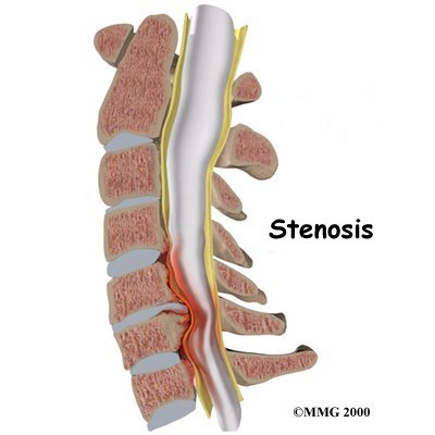 Stenosis means closed in. refers to a condition in which the spinal cord is closed in, or compressed, inside the tube of the spinal canal. Spinal stenosis may be caused by degenerative changes, such as bone spurs pushing against the spinal cord within the spinal canal.