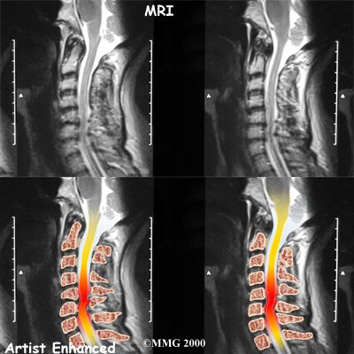MRI scans are painless and don't require needles or dye. The MRI scan has become the most common test to look at the cervical spine after X-rays have been taken.