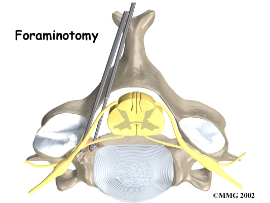 A is done to open up the neural foramen and relieve pressure on a spinal nerve root. A foraminotomy may be done because of bone spurs or inflammation.