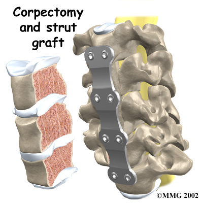 A relieves pressure over a large part of the spinal cord. In this procedure, the surgeon takes off the front part of the spinal column and removes several vertebral bodies. The spaces are then filled with bone graft material. Metal plates and screws are generally used to hold the spine in place while it heals. A corpectomy is used in cases of severe spinal stenosis and myelopathy.