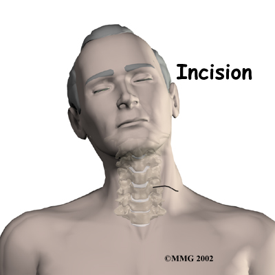 The patient's neck is positioned facing the ceiling with the head bent back and turned slightly to the right. A two-inch incision is made two to three fingers' width above the collar bone across the left-hand side of the neck. The left side is chosen to avoid injuring the nerve going to the voice box. Retractors are used to gently separate and hold the neck muscles and soft tissues apart so the surgeon can work on the front of the spine.
