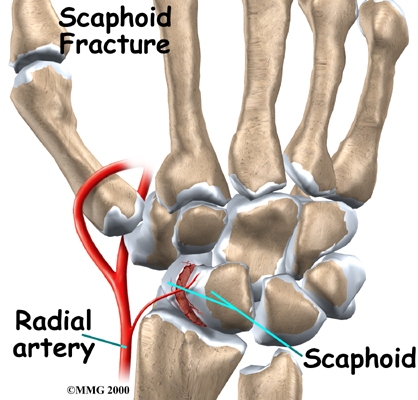 Doctors commonly diagnose a sprained wrist after a patient falls on an outstretched hand. However, if pain and swelling don't go away, doctors become suspicious that the injury is actually more serious. A fall on an outstretched hand commonly breaks the scaphoid bone of the wrist. X-rays taken at the time of the injury may not clearly show the fracture. If the fracture is not recognized early, it may not heal properly. This can lead to problems later.