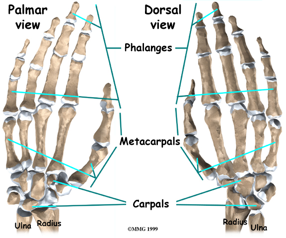 The scaphoid bone is a carpal bone near the base of the thumb. The carpal bones connect the two bones of the forearm, the radius and the ulna, to the bones of the hand. The metacarpal bones are the long bones that lie underneath the palm.