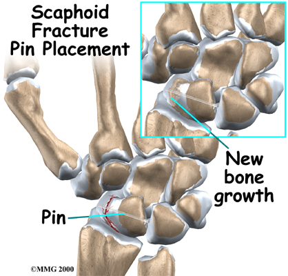 After the bone graft is placed between the parts of the scaphoid bone, some surgeons also insert a metal pin or screw across the bone. The goal is to hold the two pieces of bone tightly together, allowing them to fuse into one bone.