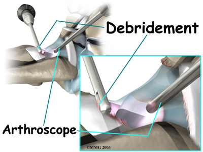 To begin, two small incisions are made through the skin on each side of the impingement area. The surgeon inserts the arthroscope to see which area of the tendons or joint capsule are irritated and thickened. The arthroscope lets the doctor see if a meniscoid lesion (mentioned earlier) is present. A small shaver is used to clear away (debride) irritated tissue from the affected ligaments. The surgeon also the tissue forming a meniscoid lesion and any areas of the joint capsule that are inflamed. Small forceps may also be used to clear away irritated or inflamed tissue.
