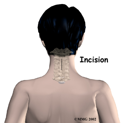 This surgery is usually done with the patient lying face down on the operating table. The surgeon makes an down the middle of the back of the neck. Retractors are used to gently separate and hold the neck muscles and soft tissues apart so the surgeon can work on the back of the spine.