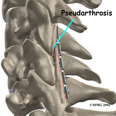 Sometimes the bones do not fuse as planned. This is called a nonunion, or . (The term pseudarthrosis means false joint.) If the joint motion from a nonunion continues to cause pain, you may need a second operation. In the second procedure, the surgeon usually adds more bone graft. Metal plates and screws may also need to be added to rigidly secure the bones so they will fuse together.