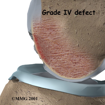 Surgeons classify defects in the knee cartilage using a grading scale from I (one) to IV (four). In a grade I tear, the cartilage has a soft spot. Grade II lesions show minor tears in the surface of the cartilage. Grade III lesions have deep crevices. In grade IV lesions, the tear goes all the way to the underlying bone.