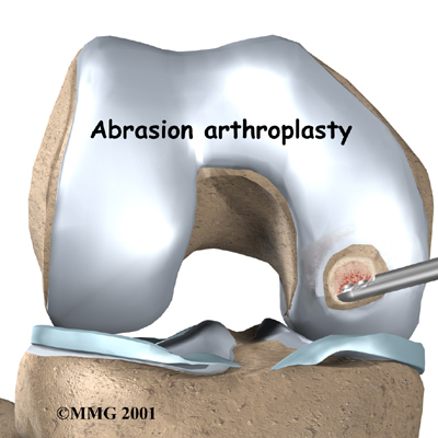 This causes the bone to become hard and polished. During arthroscopy the surgeon can use a special instrument known as a burr to perform an abrasion arthroplasty. In this procedure, the surgeon carefully scrapes off the hard, polished bone tissue from the surface of the joint. The scraping action causes a healing response in the bone. In time new blood vessels enter the area and fill it with scar tissue (fibrocartilage) that is like articular cartilage. Fibrocartilage is weaker than normal articular cartilage. Because this is not true articular cartilage, it does not function as well for weight bearing as articular cartilage. The fibrocartilage that forms may not be strong enough to remove all the symptoms of pain in the knee. This usually is a temporary solution. Symptoms may return after this surgery.