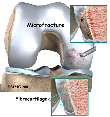 Surgeons use a blunt awl (a tool for making small holes) to poke a few tiny holes in the bone under the cartilage. Like abrasion arthroplasty, this procedure is used to get the layer of bone under the cartilage to produce a healing response. The fresh blood supply starts the healing response and triggers the body to start forming new cartilage (mainly fibrocartilage) inside the lesion.