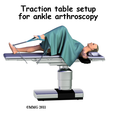 Before surgery you will be placed under either a general anesthesia or a type of spinal anesthesia. Sterile drapes are placed to create a sterile environment for your surgeon to work. There is a great deal of equipment that surrounds the operating table including the TV screens, cameras, light sources and surgical instruments. Your surgeon will apply traction to your ankle joint. The ankle joint is very tight with little space between the tibia and the talus so by applying traction, your surgeon is able to increase this space and allow the arthroscope to be inserted into that space. The end of the arthroscope will be moved about in this space to look throughout the joint.