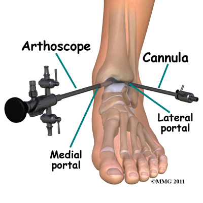 Your surgeon begins the operation by making two or three small openings into the ankle, called portals. These portals are where the arthroscope and surgical instruments are placed inside the ankle. Care is taken to protect the nearby nerves and blood vessels. A small metal or plastic tube (cannula) is placed through one of the portals to inflate the ankle with sterile saline.