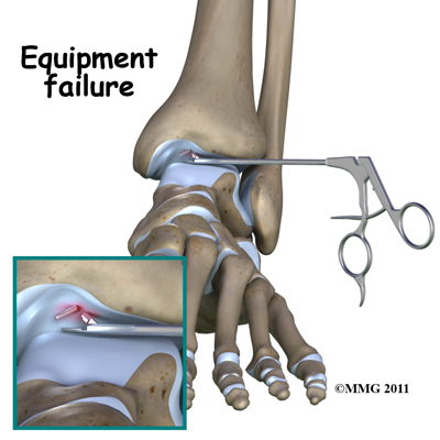 Many of the instruments used by the surgeon to perform ankle arthroscopy are small and fragile. These instruments can break resulting in a piece of the instrument floating inside of the joint. The broken piece is usually easily located and removed, but this may cause the operation to last longer than planned. There is usually no damage to the joint due to the breakage.