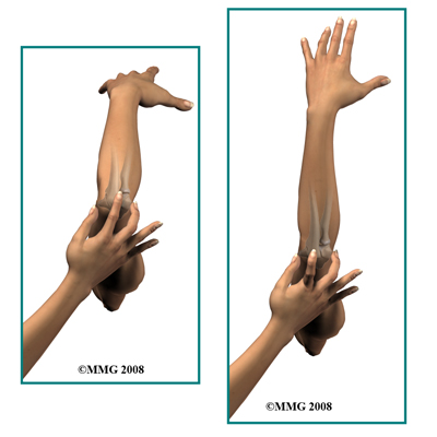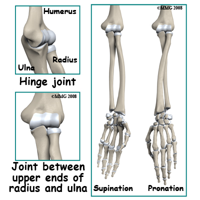The bones that join to form the elbow joint include the humerus (upper arm bone) and the radius and ulna (the two bones of the forearm). There are actually two different joints at the elbow; the first is a hinge joint between the humerus on the one side and the combination of the radius and ulna on the other. The second joint is between the upper ends of the radius and ulna. The radius can spin in this joint allowing the forearm to rotate. This allows us to position the hand into supination (the hand palm up) or into pronation (palm down).