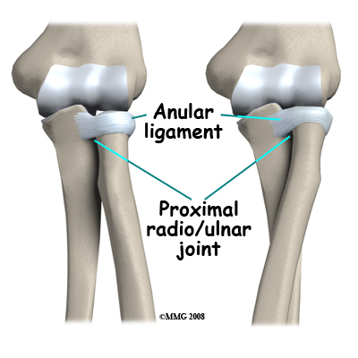 The joint between the radius and ulna is continuous with the joint between the humerus and the ulna/radius, meaning they are all encircled within the same joint capsule. There is a divot on the side of the ulna where the radial head rests and in which it rotates. The entire head of the radius is covered with articular cartilage. There is a ligament, the annular ligament that circles the radial head and keeps it snug against the ulna as it rotates. If the radial head or neck is fractured, due to the anatomy in this region the blood supply to the fractured fragments is at risk.