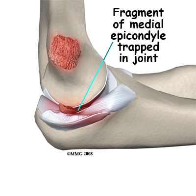 As the elbow may be opened up widely in such an injury, the piece of bone broken off may end up trapped inside the joint. In this case it is necessary to do an operation to extract the bone fragment from the joint and fix it back into place. More commonly the avulsed piece of bone is still close to its correct position and the injury can be treated non-operatively. Avulsion of the medial epicondyle as a result of a muscle pull is rare. This injury can usually be treated without surgery.