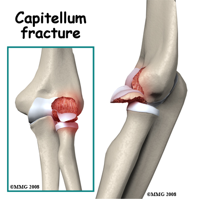 Fracture of the Capitellum: This is the rounded end of the humerus on the outer side of the elbow. It forms a joint with the radial head and is important for the stability of the joint. A piece of the capitellum can be broken off when the elbow is dislocated or when force is transmitted up the radius as a result of a fall on the outstretched hand. The floating piece may jam in the joint, limiting movement. The irregular joint surface may cause long-term wear. It is often necessary to operate on the elbow to retrieve any loose pieces following this fracture and it is sometimes possible to fix them back in position.