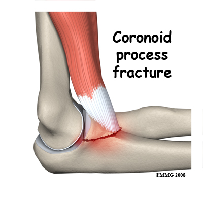 The brachialis muscle acts to bend the elbow and attaches to the coronoid process at the front of the ulna. When the flexed elbow is suddenly loaded this muscle may pull so hard that it pulls off the coronoid process. If this is an isolated injury and the fragment is not displaced it may be treated non-operatively even though the fracture goes into the joint. When this injury is combined with elbow dislocation and a radial head fracture it has a poor prognosis.