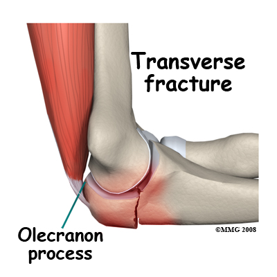 The triceps muscle straightens the elbow by pulling on the olecranon. If you fall the muscle may be contracting to straighten the elbow but the force of the fall is great enough to make the elbow bend anyway and in this situation, something must give way. Often it is the bone of the olecranon process. A transverse fracture into the joint is the common pattern. An impact on the point of the elbow may result in a complex fracture where the bone breaks into multiple pieces.