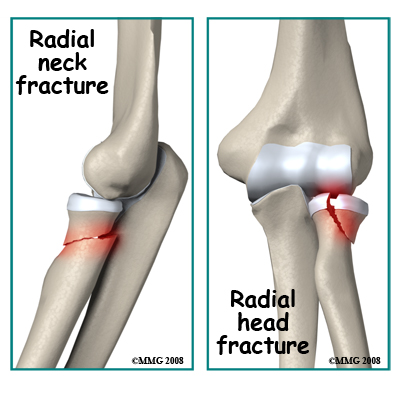 Radial Neck Fractures: Longitudinal compression forces such as those resulting from a fall may cause a transverse fracture of the radial neck just below the head of the radius. A variable amount of compression and skewing of the bones can occur. A direct impact on the elbow may also cause this fracture. Due to the importance of the radial head in the functioning of the forearm, skewing of the bones as a result of this injury may limit forearm rotation. Also, due to the radial head being covered by articular cartilage a fracture through the neck region may deprive the radial head of its blood supply.