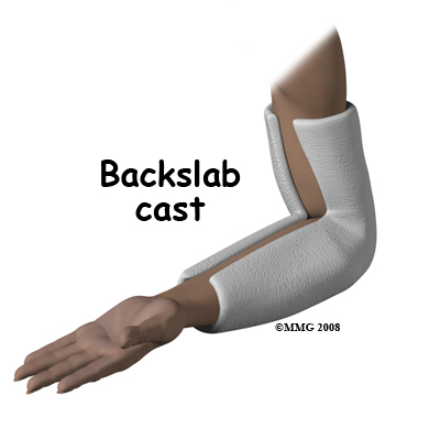 The cast is usually applied from above the elbow to the wrist. If it is necessary or desirable to prevent rotation of the forearm then the wrist should be included in the cast. Often this is not necessary and a simple splint bent at the elbow is enough. There are also many commercially available braces that can be used in place of a cast. Braces and splints allow the arm and elbow to swell without getting compressed inside the cast.
