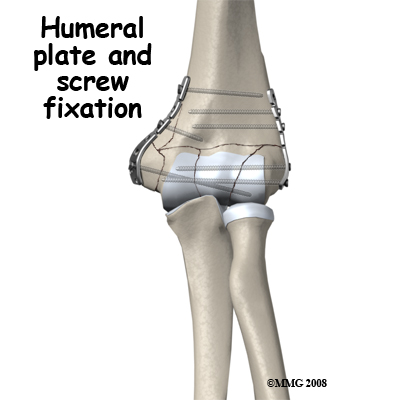 Intra-Articular Distal Humerus Fractures: These are the most challenging fractures of the region to treat. Each fracture is different; however the rationale for most fractures is to restore the joint surface exactly then fix the joint to the shaft of the humerus securely. If the reduction is aligned as anatomically correct as possible it forms a stronger and better fix, but this alignment is not as important as the restoration of the joint surface itself where some inaccuracy is permissible. There are usually pins or screws extending from one condyle to the other, which join the joint fragments, and plates along the columns to fix the joint to the shaft of the humerus.