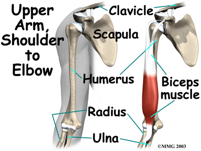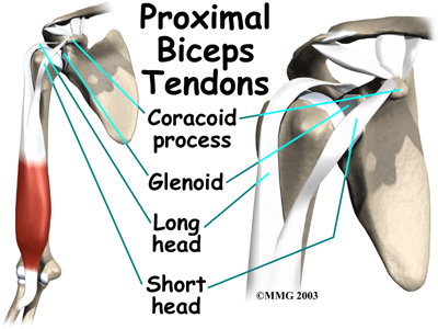 The upper (proximal) end of the biceps has to the shoulder. The main attachment is the long head of the biceps. It connects the biceps muscle to the top of the shoulder socket, called the glenoid. The short head of the biceps angles up and in to its attachment on the corocoid process of the shoulder blade. The corocoid process is a small bony knob in the front of the shoulder.