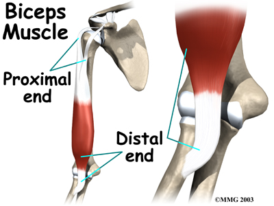 The lower biceps tendon is called the distal biceps tendon. The word distal means that the tendon is further down the arm. The upper two tendons of the biceps are called the proximal biceps tendons, because they are closer to the top of the arm.