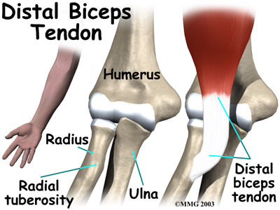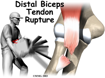 The most common cause of a distal biceps rupture happens when a middle-aged man lifts a box or other heavy item with his elbows bent. Often the load is heavier than expected, or the load may shift unexpectedly during the lift. This forces the elbow to straighten, even though the biceps muscle is working hard to keep the elbow bent. The biceps muscle contracts extra hard to help handle the load. As tension on the muscle and tendon increases, the distal biceps tendon where it connects to the radius.
